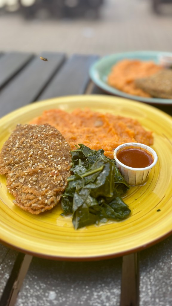 Umjesto klasičnog kebaba, ovaj put smo za glavno jelo uzeli dnevni meni – pohani sejtan sa sjemenkama, pire od batata s blitvom i BBQ umakom. Pravi comfort food, pogotovo nakon duge noći. 🥂 🙊